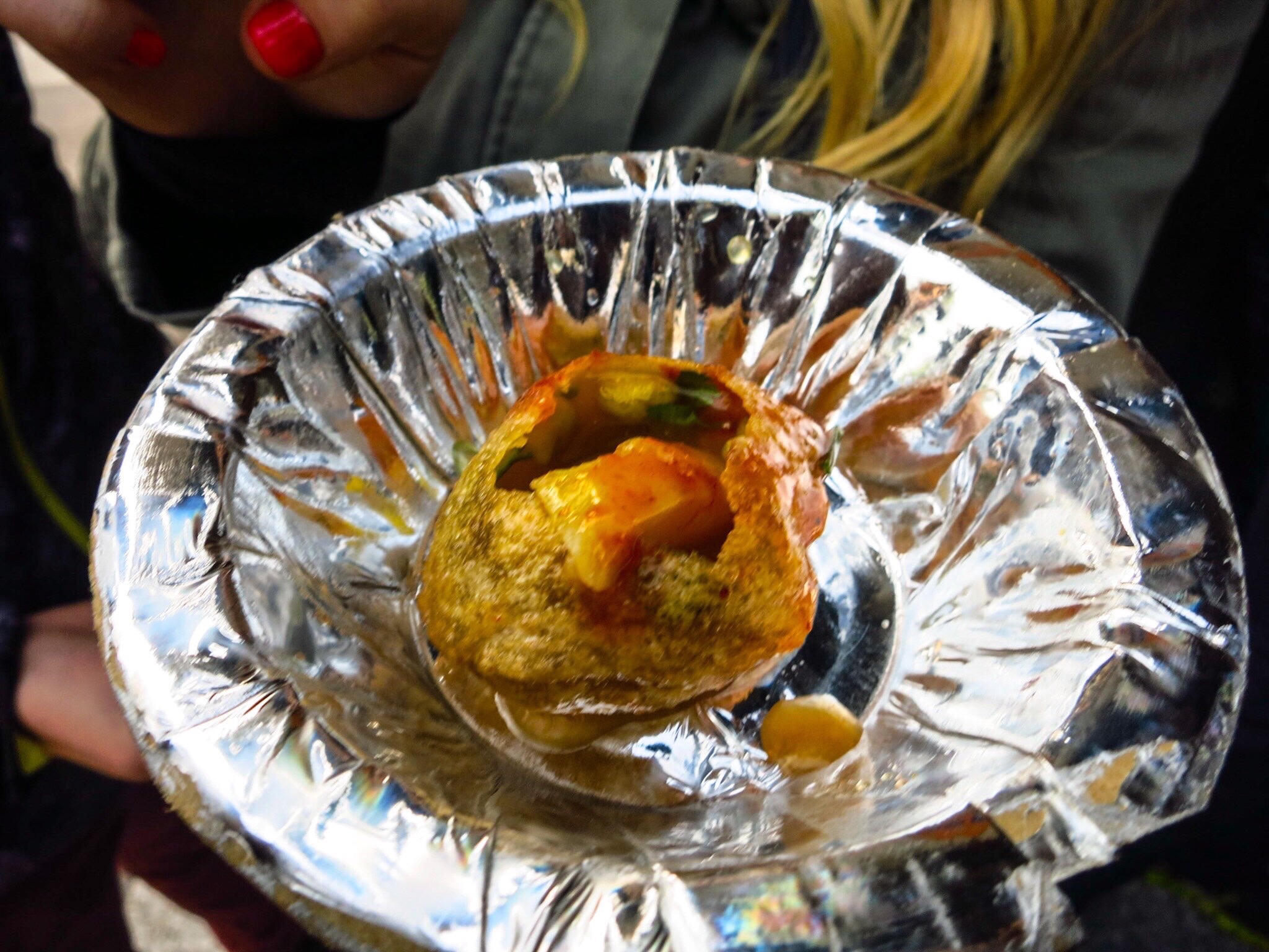 Pre-lunch chaat (Indian word for savoury snack) of Pani Puri! Potato, chilli, onion, chickpeas and spices in a fried little puff of bread. Fascinating to watch the vendor punch a little hole in the puff with his thumb and fill it with the delicious watery (go for the stand that uses mineral water only) mixture. He will keep piling them into your bowel until you almost run away. About 40c for 8 of these little guys!